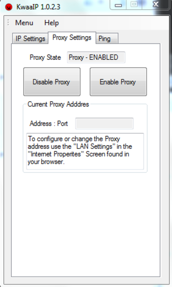 KwaaIP has been designed to aid the general support user with basic tasks during the day.The Features of KwaaIP include the quick enable and disable of Proxy Settings. Allows the user to check IP Address and Hostname with a click of a button. Can easily switch your network adapter settings between a Static or DHCP Address. KwaaIP Allows you to save you IP Addresses for later use. Pinging the same devices over and over can become a tedious task, KwaaIP will allow you to ping devices with a click of button and store the IP Addresses with a name description for later easy access. This application a free and may not be sold.