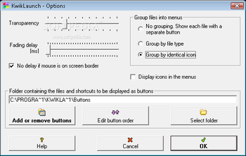 ï¿ New buttons are added by simply pasting shortcuts into the main button folder, which can be opened from the context menu or the options dialog window of KwikLaunch.
