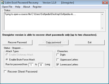The utility uses the brute force attack mode, which means that it tries all possible combinations to guess the password. If you remember details about the key, then you can narrow down the search time by indicating a range for the number of characters, along with the type of characters between uppercase and lowercase letters, and numbers. The entire task can take a very long time, depending on the complexity of the password.