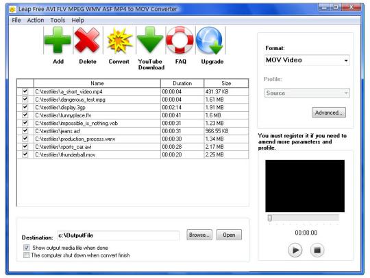 Leap Free AVI FLV MPEG WMV ASF MP4 to MOV Converter Screenshots
