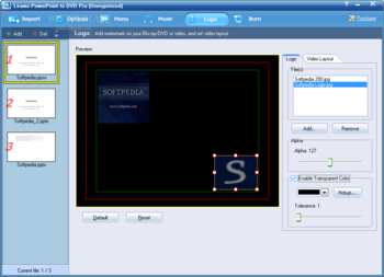 Before burning the disc, you can also add background music to the output and define a logo that wil be used as a watermark. The application also enables you to set the video layout by adjusting the margin size and filling color.