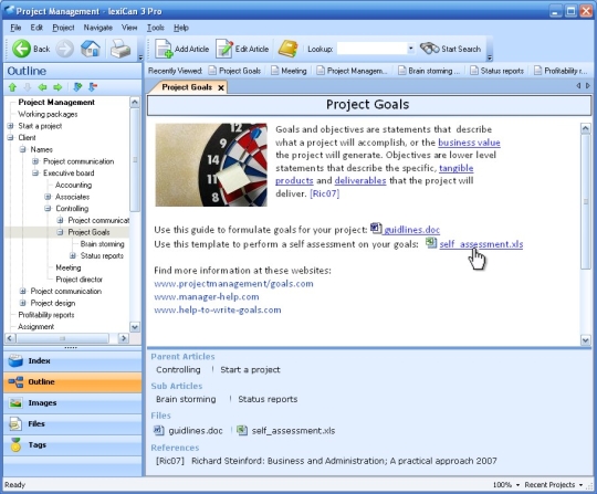 lexiCan is the simple Knowledge Management Software. It is for knowledge workers, scientists, students, and managers.You can use it to organize research material and material collections. You can built knowledge bases and project documentations. you can set bookmarks, file links, pictures, tables and cross references in the context you want. Features include A to Z-index, multiple outline, full text search and source management.