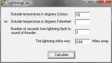 LightningCalc was designed to be a relatively simple application. You provide it the current outside temperature (in degrees F or degrees C - its okay to guess) and the time from the flash of lightning to the clap of thunder. Given this information, LightningCalc will calculate the distance (in miles) to two decimal places.