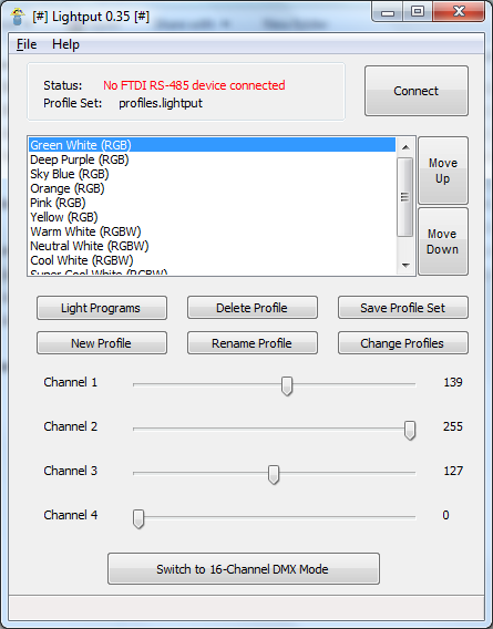Lightput is a DMX control software for USB RS-485 communication devices. Lightputs goal is to make high-end LED lighting more accessible to homes, small businesses, and creative projects working on a budget that wish to have high quality, customizable lighting. Lightput is a simple to use freeware solution for controlling lights through DMX communications, which is a widely used, time-tested system for controlling lighting. Lightput is designed to control lighting as soon as it runs in a very simple and easy to use way. Lightput does not attempt to profile different lights on the market or specifically support effects like panning. Lightput enables your computer to communicate with DMX lighting using cheap, widely available hardware.