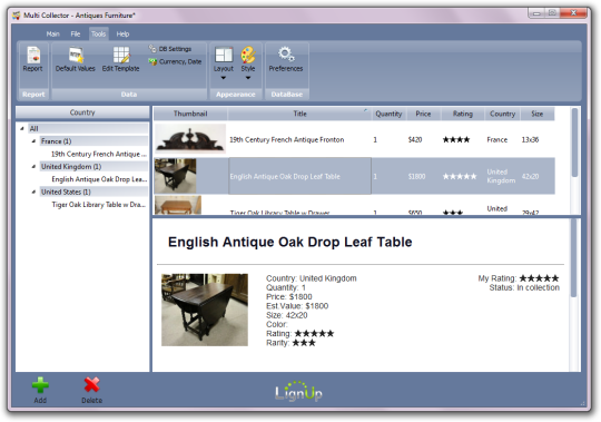 LignUp Multi Collector is a universal tool for managing many collections with any collectibles. It includes many functions like creating custom collection database; capturing images from web camera, get images online, correct images in graphic editor, edit various categories; password protection; report generation as PDF document and HTML site; smart filters and data sorting.Database manager allows to easily switching between different collections.Customers can change application style and customize view layouts by using thumbnail, statistic, item preview, category tree, table list widgets. Collections can be imported, exported and printed.