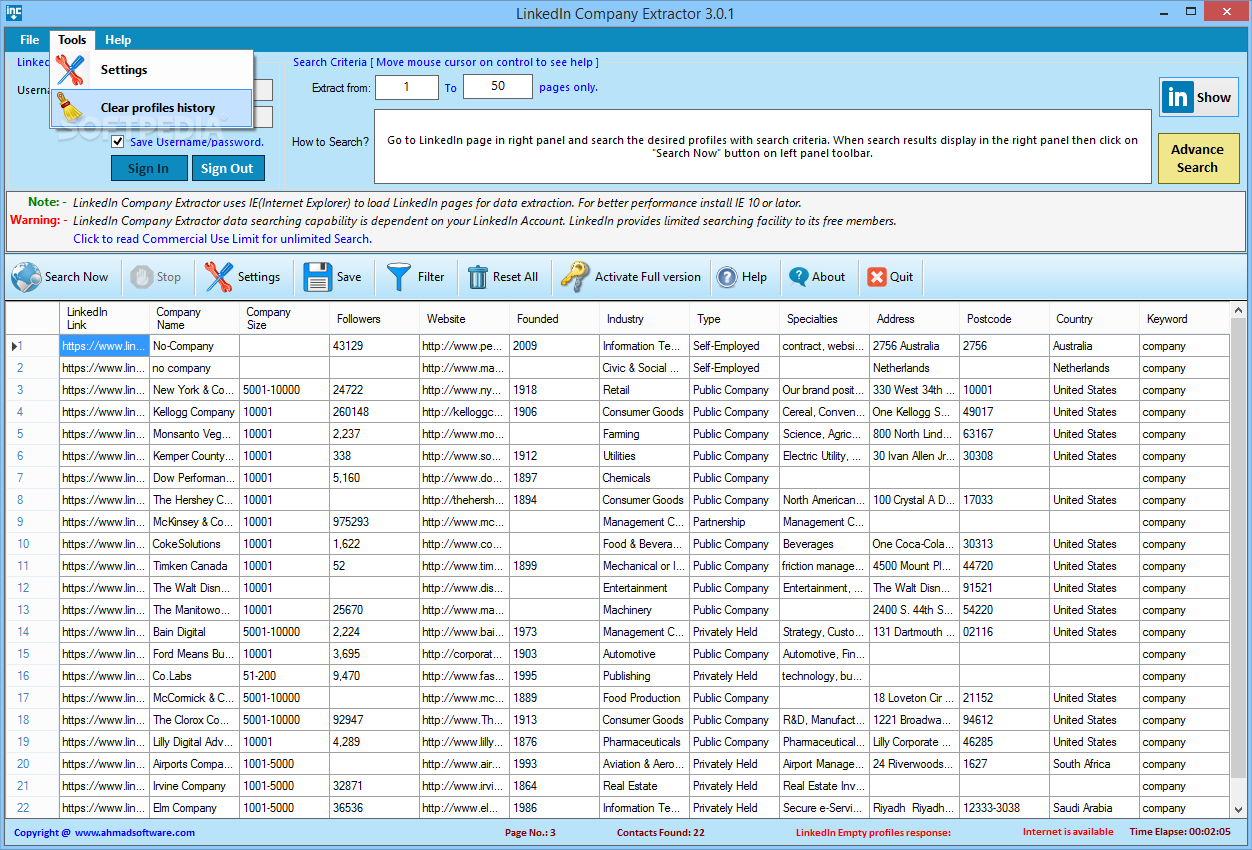 To conclude, LinkedIn Company Extractor is a handy utility that enables you to gather information about various companies from LinkedIn and save it locally. It uses the website’s Advanced Search function and allows you to filter the collected data before it is exported.