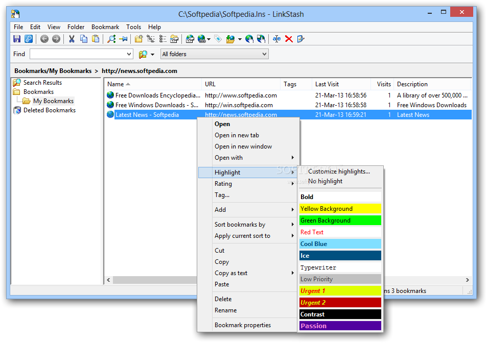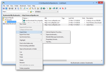 LinkStash offers you the possibility to open the selected bookmark in a new window or tab, open with the preferred web browser, highlight the bookmarks with different colors, rate them, add tags (e.g. Business, Fun, Games, Education, Internet), and sort bookmarks by various criteria, such as name, description, comment, keyword, and URL.