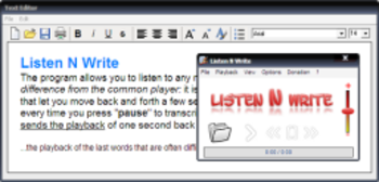 Listen N Write Portable can be used to play and transcribe ordinary WAV or MP3 recordings. Listen N Write has special features simplifying the transcription work as you can control via keys (while using its integrated word processor) and insert time markers (bookmarks). Audio stream is automatically re-winded a few seconds when pressing the Stop key. Listen N Write can be considered the standard program for any transcription because of its simplicity of use and small size.