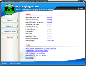 Local Keylogger Pro allows you to monitor all users activity on any computer in real time and record each computers usage history. Local Keylogger Pro makes it easy to view in real time the screenshots of any computer, all typed keystrokes, visited Web sites, used programs. You can view a list of running processes and terminate undesirable ones. Local Keylogger Pro can record all users activity to the log file. This information can be exported to HTML for convenient viewing in your web browser, or exported to MHT file for analysis. This allows you to see how long users worked with particular programs, how much time they spent in the Internet, what sites they visited, what they typed in e-mails or chats. Version 3.1 has new interface and supports SSL/TLS SMTP servers for email delivery.