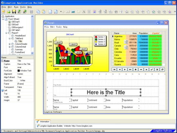 Longtion Application Builder is a tool for designing and developing Windows-based applications, database applications, Web applications and autorun cd menu without writing any code. And you dont have to be a software programmer to do it. With its intuitive IDE and drag-and-drop objects, its quick to learn and easy to use. It requires no programming knowledge. Connect to database servers. Create application that can create, restructure, fetch data from, update, and otherwise manipulate local (dBASE, FoxPro, and Access) and remote database servers (Oracle, Sybase, Informix, Microsoft SQL server, DB2). Create charts and reports fast and easy. With Longtion Application Builder you can build standalone Web applications exactly the same way you would build normal database applications. It is a revolutionary new way to create web-based applications. The standalone Web application is a web server that run without dependencies from any other web server (IIS or Apache).