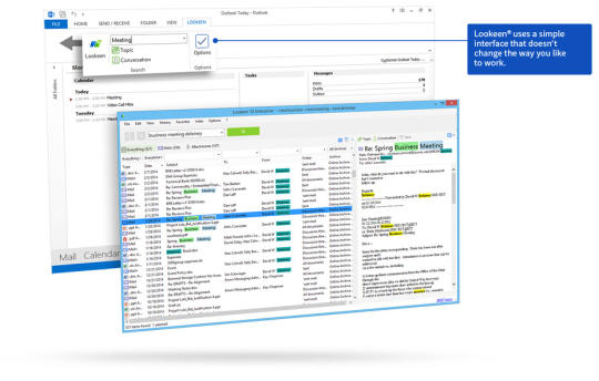 Lookeen - The award-winning Windows Desktop and Outlook search! Find files and emails in record time and with maximum reliability. The data you are looking for can be found at any time, thanks to real-time indexing. Lookeen searches all desktop and network files and Exchange Server data (such as, emails, contacts, appointments, tasks, PST archives, and Public Folders) as well as local Outlook files. Lookeen finds keywords in PDFs and can handle all common file formats (.xlsx, .pptx, .docx, .php, .jpg, .html). Rollout Lookeen company-wide with the integrated group policies (starting at Lookeen Business Edition) and browse external indexes (Lookeen Enterprise Edition only). Lookeen is compatible with virtual desktop environments (VDI) like Citrix and VMware. The simple operation and intelligent search filters help you to easily search large amounts of data.