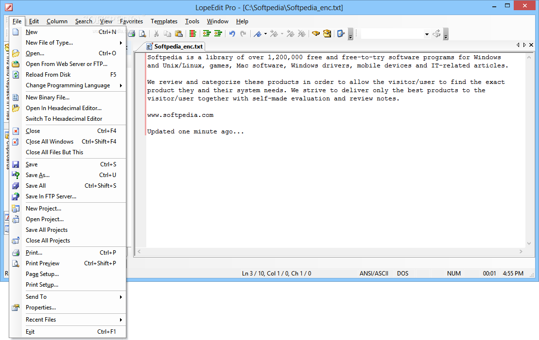 LopeEdit Pro is a powerful programming editor and replacement of Windows Notepad. It has tabs to select between open files, supports syntax highlighting for multiple programming languages (C/C++, Java, JavaScript, Visual Basic, VBScript, HTML, ASP, JSP, SQL, Cobol, C#, CSS, Pascal, Perl, PHP), incorporates build-in hexadecimal editor, some util docking windows (File Browser, FTP Browser, Favorites, Projects Manager, Multiple Clipboards, Code Templates Manager, ASCII Table, MS-DOS console), file compare, visual styles (Office 2003, Visual Studio 2005, Visual Studio.NET 2003, Windows XP), UNICODE and UTF-8 support, find and replace by using regular expressions, Favorites menu, allows two horizontal/vertical tab groups, print preview, bookmarks, edit marks for modified lines, opens files from HTTP/FTP sites, saves files directly in FTP sites and more.