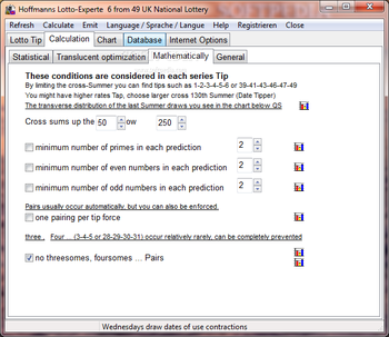Lotto-Experte 6 from 49 UK National Lotery gives you the possibility to browse throughout different draws, carry out statistical calculations (e.g. you may avoid certain numbers, include only certain numbers), optimize lottery ticket numbers (e.g. allow a custom number of figures from the last draw, set up maximum matches with other draws, configure minimal similarities), as well as limit the number of primes and even/odd numbers in each prediction.