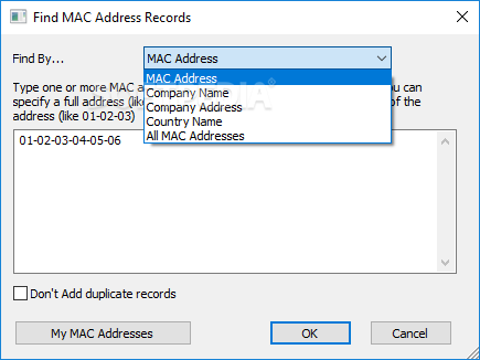 MACAddressView is a very fast application developed to find a MAC address based on user-defined information such as company name or address and country.