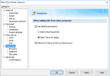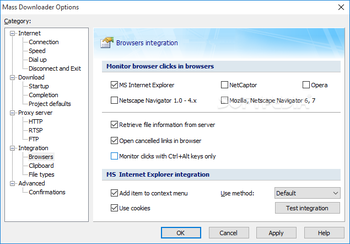 Supports Drag-and-Drop links from Internet Browsers to the Main window and Drop Box, paste links from the Clipboard. Also, Mass Downloader intercepts clicks in Netscape Navigator and Internet Explorer, embeds its item to the Microsoft Internet Explorer context menu