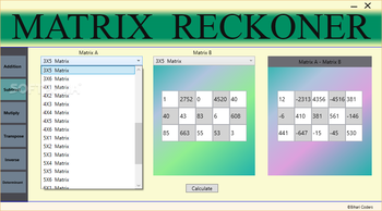 Matrix Reckoner can perform a series of calculations using the two matrices as input, such as addition, subtraction and multiplication. Moreover it can also perform a set of operations for which a single matrix is required: transposition, calculating the inverse matrix and the determinant.