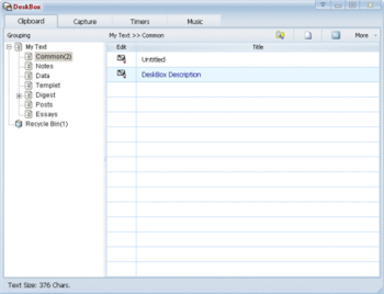 DeskBox is multi-purpose utility software, integrated notes management, clipboard, screen capture, reminder, music sorter and other practical and common functions, is your good work and study partner, a good assistant. DeskBox has a beautifully designed and comprehensive interface making it intuitive and convenient to use. Main Function are Clipboard: for notes management, text capture and collection, copy and paste, quick note, etc, Capture: for screen capture, image management, viewing, editing, processing, slideshow, etc, Timers: to create a variety of timing tasks, such as Reminder, Run Program, Open File, Play Music, Shutdown, etc., and Music: to organize and play your music. Software Feature - Perfect combination of a variety of common functions, efficient and convenient. - User-friendly appearance, to support a variety of beautiful skin. - Full drag and drop operation, comfortable and faster. - Data engine based on lightweight, saving memory resources. - Clean software; do not write the system registry.