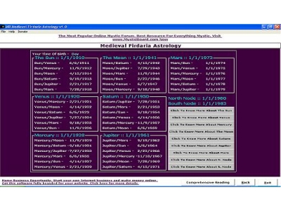 MB Medieval Firdaria Astrology is a free software by MysticBoard and works on Windows 10, Windows 8.1, Windows 8, Windows 7, Windows XP, Windows 2000, Windows 2003, Windows 2008, Windows 98, Windows ME, Windows NT, Windows 95, Windows Vista, Windows 2012.