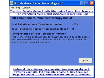 MB Telephone Number Numerology Software does a free telephone number numerology analysis and tells you if the telephone number or the mobile number you are using is suitable for you or not. This wonderful numerology software for phone number numerology reading takes into account your numerical associations on the basis of your name and other details that you provide and tells you if the phone number you are using will influence luck in your favor or not. If you want to know if your present telephone number is lucky for you, considering your nature, personality and profession, you should download MB Telephone Number Numerology Software and get a free telephone number analysis or telephone numerology interpretation. Numbers have the power to influence the situations around you. Your numerical associations also influence your luck and determine to what extent luck or chance would be on your side. The telephone number or the mobile number that you use also plays an important factor in influencing your luck. Get a telephone number analysis or telephone number numerology reading from MB Telephone Number Numerology Software and know the appropriate phone number for you so that you can make number influence luck in your favor.