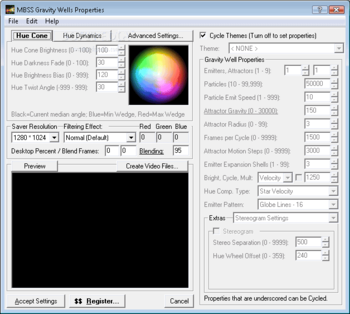 MBSS Gravity Wells is the quintessential celebration of motion, color and mathematics that you can enjoy as particles fill the screen in brilliant patterns as influenced by wandering gravity wells. Setup properties of the emitters and attractors along with the Hue Cone for particle coloring.