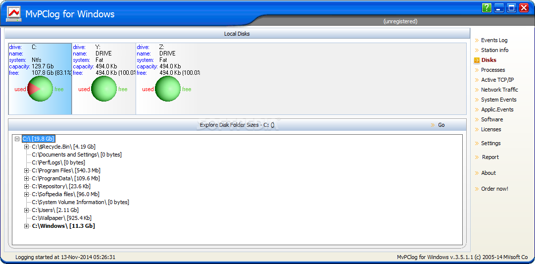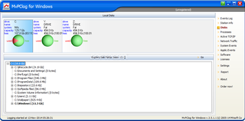 McPClog can easily generate comprehensive reports that include the logs created for each individual function. Aside from the real time events log, the software can display the status of all the disks mounted on the computer, both physical and virtual, as well as the degree of occupied memory for each of them. You may view a list of all the currently running processes, as well as active TCP/IP connections.