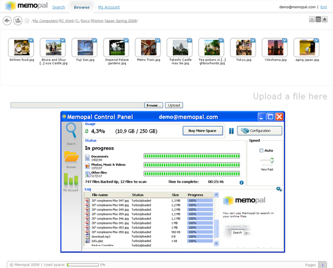 Memopal automatically backs up your computer and puts all your files online for safe storage, so that you no longer have to worry about the possibility of losing importand data. Access files on your computer from anywhere in the world and share them with your friends and collegues. Our servers are located in 3 different continents making your data safer with us than with any USB disk or physical media, and protecting it even from natural disasters.