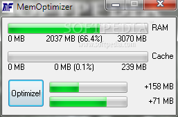 MFMemOptimizer is a feather-light and portable application designed to free up memory on your computer, in order to increase its performance and allocate RAM to other running processes. It doesn't include any configuration settings, since it executes the task using predefined parameters.