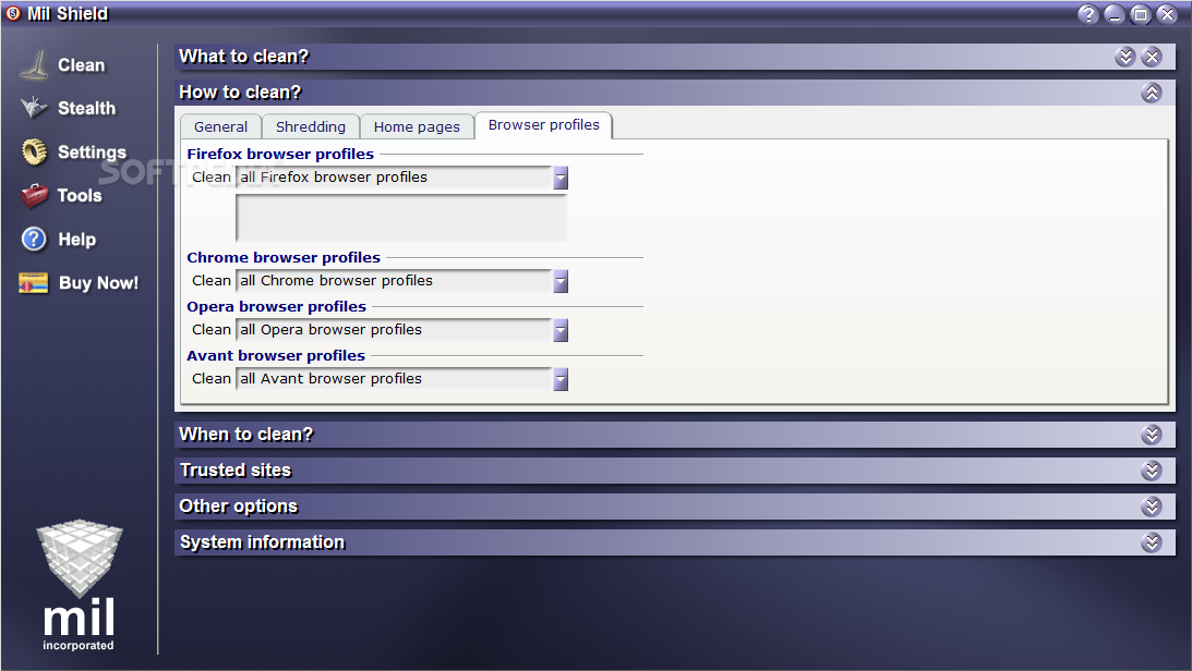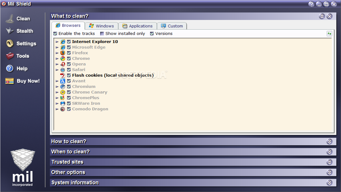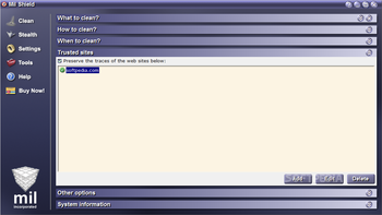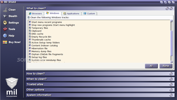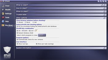 Schedule background cleaning at each startup or shutdown, or when the browser windows are closed. While running in background Mil Shield is completely invisible.