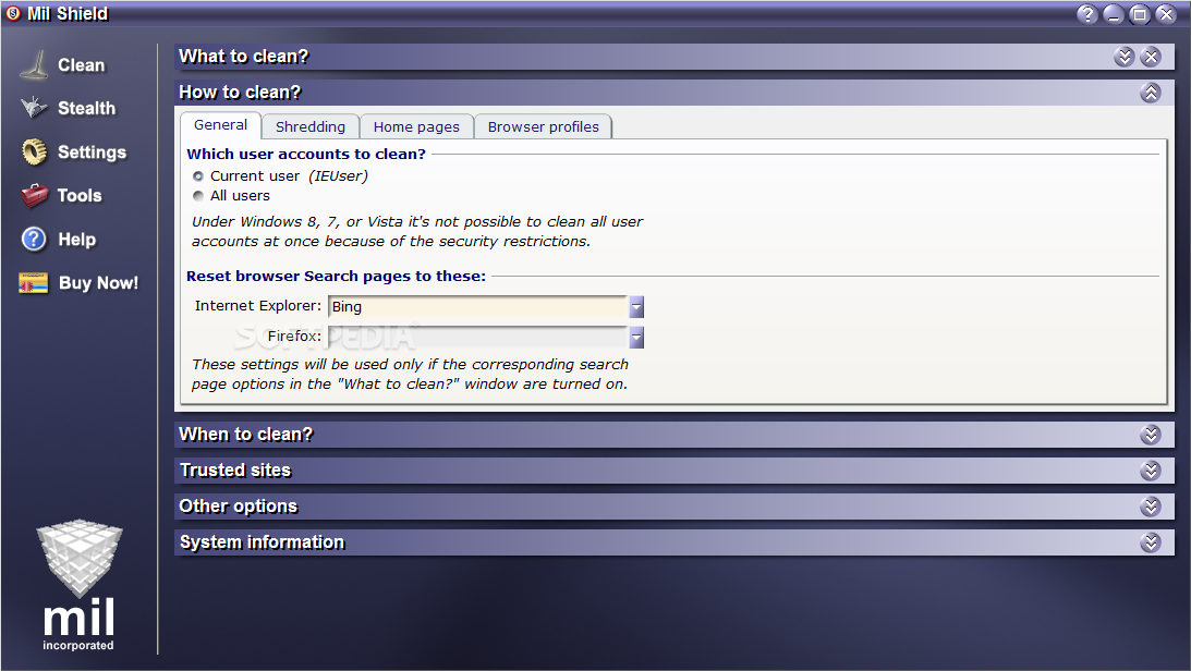 You can download Mil Shield which is 4.56 MB in size and belongs to the software category Secure cleaning. Mil Shield was released on 2016-01-10 and last updated on our database on 2017-04-12 and is currently at version 9.
