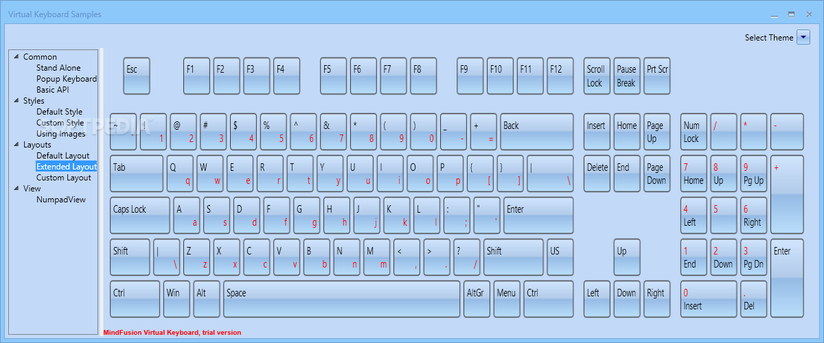 Moreover, MindFusion Virtual Keyboard for WPF offers a number of samples that are designed to showcase various capabilities. Several keyboard styles and layouts are included, and you can cycle between them while switching between the available themes.
