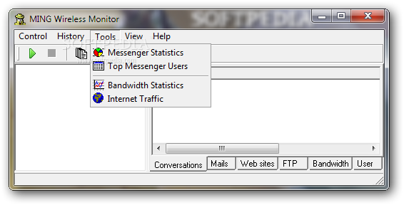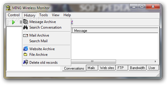 MING Wireless Monitor is a simple and affordable software solution for users who want to control, monitor, and archive unlimited Internet traffic on the local wireless LAN, including instant messages (AOL, MSN, Yahoo, ICQ, MySpaceIM, FacebookIM, WarcraftIM and QQ), emails sent and received, web sites visited, and files downloaded. The manager can view records in the database, search by key word, watch top users, monitor bandwidth and so on. It is able to record everything your employees or kids do online automatically in real time. It's easy to use, and it can run in stealth mode. MING Wireless Monitor needs AirPcap wireless packet capture device.