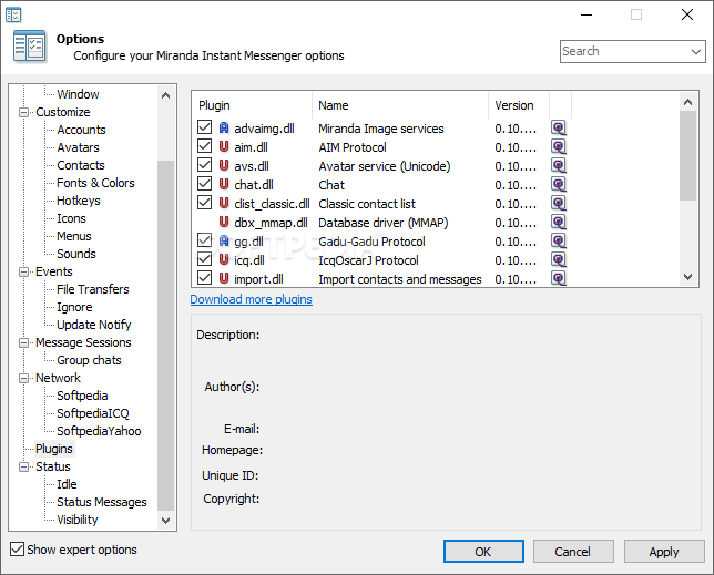 Miranda IM is a free software by Miranda IM and works on Windows 10, Windows 8.1, Windows 8, Windows 7, Windows XP, Windows 2000, Windows 2003, Windows 2008, Windows 98, Windows ME, Windows NT, Windows Vista, Windows 2012.
