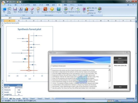 MIX Pro is professional software for meta-analysis that runs within Excel 2007 and Excel 2010. MIX Pro users can create and edit their own data sets in the easy spreadsheet interface of Excel.The available feature set is very comprehensive and conveniently categorized in exploration, synthesis, and evaluation procedures. Numerical features include raw data explorations, multiple heterogeneity statistics, standard, cumulative, and Bayesian syntheses, exclusion sensitivity analyses, tests for data trends associated with selective dissemination, and various bias correction procedures, to name a few.MIX 2.0 Pro is also exceptionally versatile when it comes to graphs. The following graphs are currently integrated: simple forest plot, histogram, normal-quantile plot, Galbraith plot, LAbbe plot, heterogeneity funnel plot, Baujat plot, synthesis forest plot, cumulative forest plot, Bayesian triplot, exclusion sensitivity plot, weighting sensitivity plot, selectivity box plot, selectivity regression plot, and the trim and fill plot.