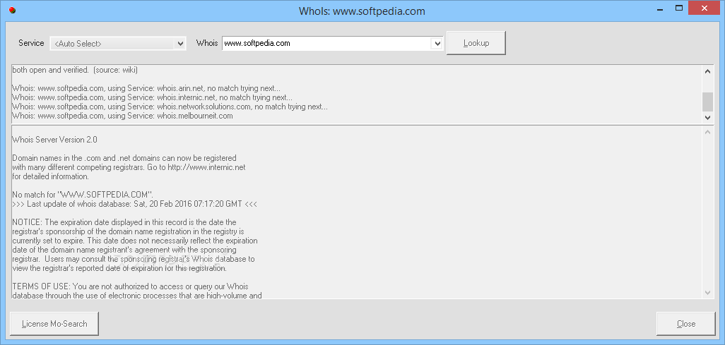 The program can help you find extensive data about a website by searching the domain in WHOIS files, then returning the found results.