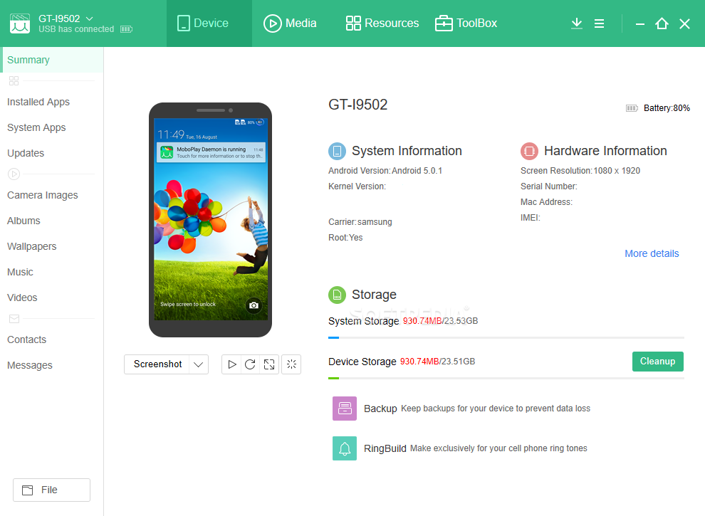 After you connect your phone, you can view basic details about it by clicking the Device button. Among the specified details you can find the device's name, operating system, kernel version, carrier, screen resolution, serial number, MAC address and IMEI. However, the same Device section lets you manage applications, updates, camera images, albums, wallpapers, music, videos, contacts and messages.