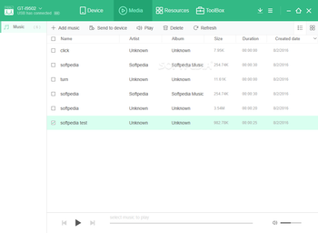 The Media tab lets you add music files to your device or view a list of already existing items. To add audio content, you just have to click the Add Music button and select suitable files from your PC. You can also play or delete items and refresh the list. If you need new content for your device, you can navigate to the Resources category and make your pick according to your preferences.