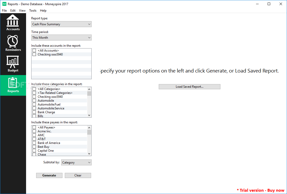 Generate detailed reports and charts and see exactly where your money is going. Use reports to make tax time easier