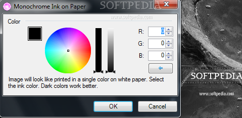 The control panel of the monochrome plugin is user-friendly, showing a color wheel for picking the ink color. This can also be done by directly inputting the RGB code, provided that you have this information at hand.