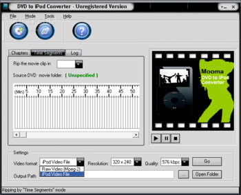 With Mooma DVD to iPod converter , you can convert almost all kinds of DVD including CSS protected DVDs to iPod video (mp4) format. You may capture and convert any segment or chapter of a DVD movie to iPod mp4 format with Mooma DVD to iPod converter.