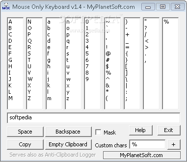 Mouse Only Keyboard is a free software by MyPlanet Software and works on Windows 10, Windows 8.1, Windows 8, Windows 7, Windows XP, Windows 2000, Windows 2003, Windows 2008, Windows Vista, Windows 2012.