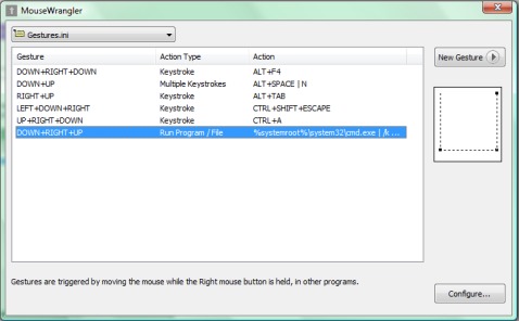 MouseWrangler monitors the mouse while Right-Click is held and keeps track of the movements made. When a set of movements is made, called a "gesture", an action is performed. MouseWrangler can simulate keystrokes, or run programs and files to automate common Windows tasks (like closing programs, minimizing programs, saving files). For more complex actions, MouseWrangler can also be used to trigger external macro programs. Features include detects normal up, down, left, and right directions, optionally detects diagonal movements, single and multiple keystroke emulation, program and file execution, optional suggestion popup, help popup, scratchpad, and auto correction, and highly configurable.