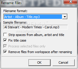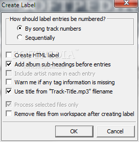 You can write new tags to replace the original ones, such as title, track, artist, album, year, genre and optional comments. Plus, it's possible to determine these data using a specific pattern, as well as rename the tracks. In addition, you can also create labels numbered by track or sequentially. The window can be set to stay on top of other applications and the list refreshed in case new items were inserted.