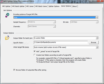 MP3 Splitter Joiner Pro splits a large MP3 file (up to 10 GB) into multiple smaller pieces, and joins multiple MP3 files into a single file. You can split a MP3 file by file size, pieces count, time or custom selections. MP3 Splitter Joiner Pro provides a time slider bar to visually position the points where you want to split. You can also preview every custom piece, and split with fade-in and fade-out effect and forward and backward overlap. The MP3 splitter keeps ID3 tags information and supports to custom title of target MP3 ID3 tag. For example: add sequence and total number to title, makes you can identify output pieces in your MP3 player, iPod, and iTunes easily. To save your time, MP3 Splitter Joiner Pro also supports batch split, you can split a batch of MP3 files at a time. The software splits MP3 files directly without re-encoding; so it exactly keeps sound quality of original MP3 files.The MP3 joiner joins MP3 files into single one file. Any MP3s are supported; even theyre encoded different encoding parameters such as sample frequency, bit rate, and channels. And you can customize encoding parameters of target MP3. The program also supports batch join. The feature allows you to insert one or more MP3 files to beginning of a batch MP3 files, and append one or more MP3 files to end of a batch MP3 files.