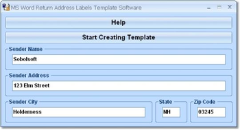 This software offers a solution for users who want to create return mailing labels. The easy to use form provides 3 lines for entering, Name, Address, City, State and Zip. With just one click the application will create a Word doc with labels containing the required data. The user can easily check and, if necessary, edit the labels in the Word document before printing.