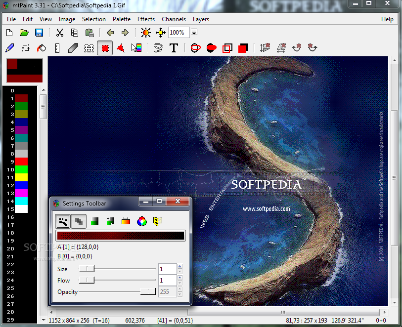 mtPaint is a simple painting software developed from scratch so you can easily create pixel art and manipulate digital photos. It uses the GTK+ toolkit (version 1 or 2) and runs on PCs via the GNU/Linux or Windows operating systems. Because of its simplicity it can also run on older PC hardware (e.g. a 200MHz CPU and 32MB of RAM). By default it is in the English language, but there are also translations available for other languages such as Spanish, Czech, French, Portuguese and Brazilian Portuguese.