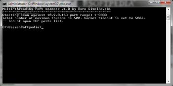 The syntax is portscanner.exe IP_address number_of_threads starting_port ending_port timeout. Therefore, you can specify the IP address of the machine you're attempting to scan, number of threads to use (maximum is 500 for each connection), port range, and timeout (milliseconds). The socket timeout is set to 50ms.