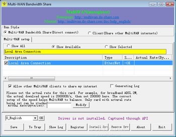 The first one requires your computer to be connected to the Internet and makes it act as a server for other Multi-WAN clients that want to share the Internet connection. In this case, you must select the desired network card and set its corresponding 'Actual Rate' (bytes/second), which is used for proportionally allocating the bandwidth between clients.