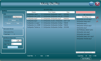 Music Shuffler offers support for an automatic search mode which is activated upon program startup. The tool automatically looks for audio content on the target devices and reveals a list with all identified songs. A few details are shown about each audio file, like name, file path, size, and total number of files.
