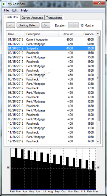 A simple chart (shown above) that instantly reflects your short and long term cash flow based on the current account balances and transactions you enter. This chart lets you see immediately if and when your balance falls below zero.