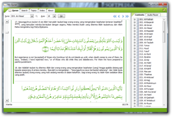 Easy to set up and bearing a friendly user interface, this application was especially created in order to supply a well organized digital version of the most important text of Islam. The verses are neatly structured and from the 'Contents' section of the right-side panel of the main window you can select the excerpts you want to read.